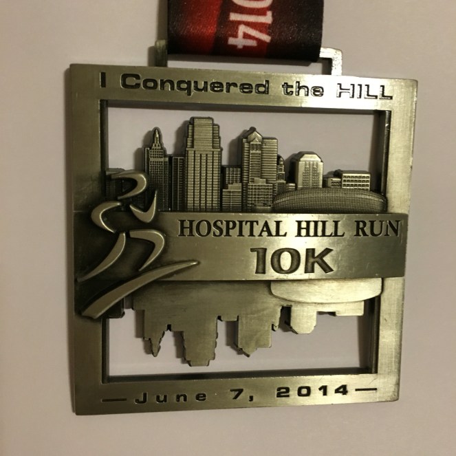 I have run Hospital Hill for the past couple of years. I have run the “Re-Run” option both times! This is where you run the 5K on Friday night and then either the 10K or half marathon on Saturday morning – I have only run the 10K for this set of events. The metals are always large and fun! The run last year was a feat for me – the previous year, this event took me out of running for 5-6 months. This year, I was stronger and ready to take on the challenge!