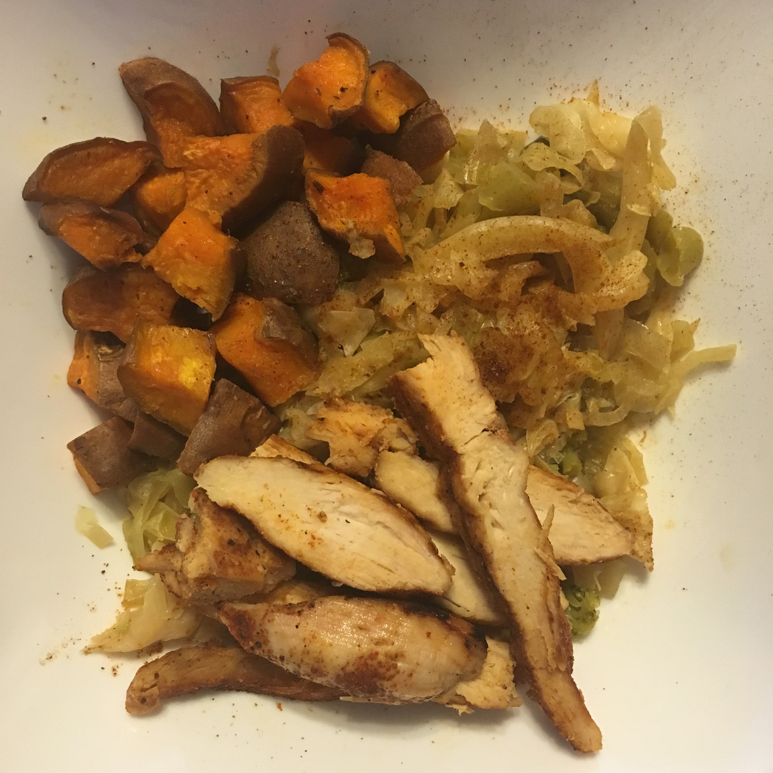 [dinner]Â cabbage broccoli stir fry + roasted sweet potato + grilled chicken