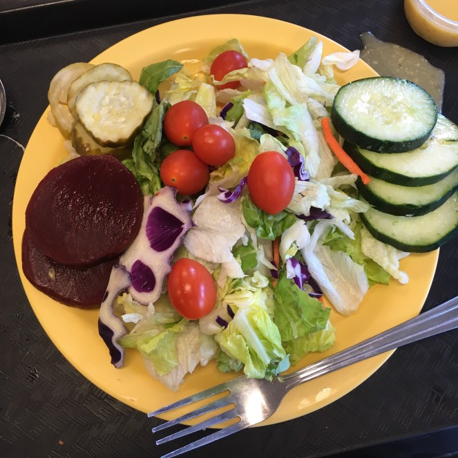 I chatted about my run and the party with my MIL while making a more substantial lunch – eggs, salad with black forest ham, cucumber, tomato, and italian dressing.