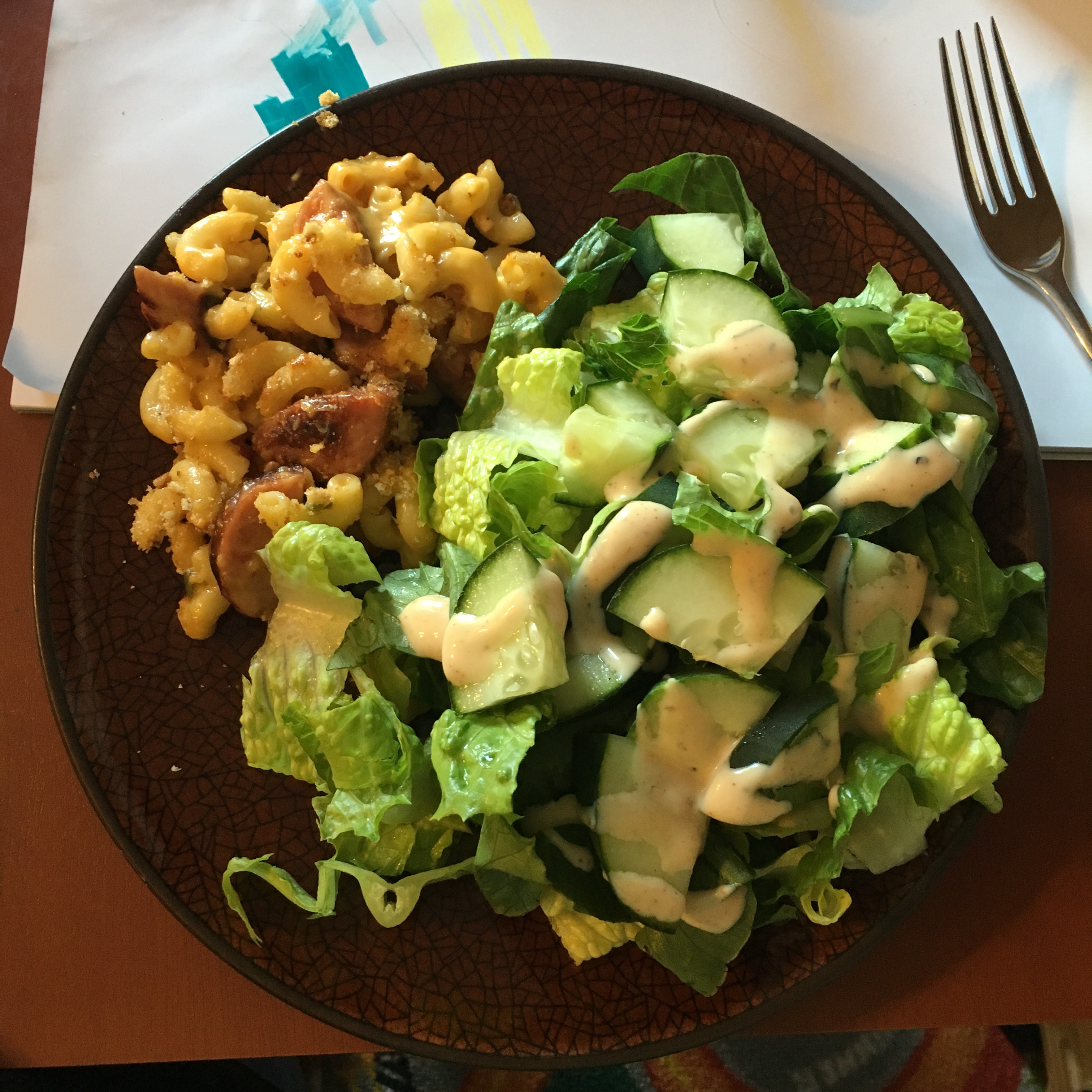 [dinner] homemade macaroni bake + romaine salad with cucumber and spicy ranch