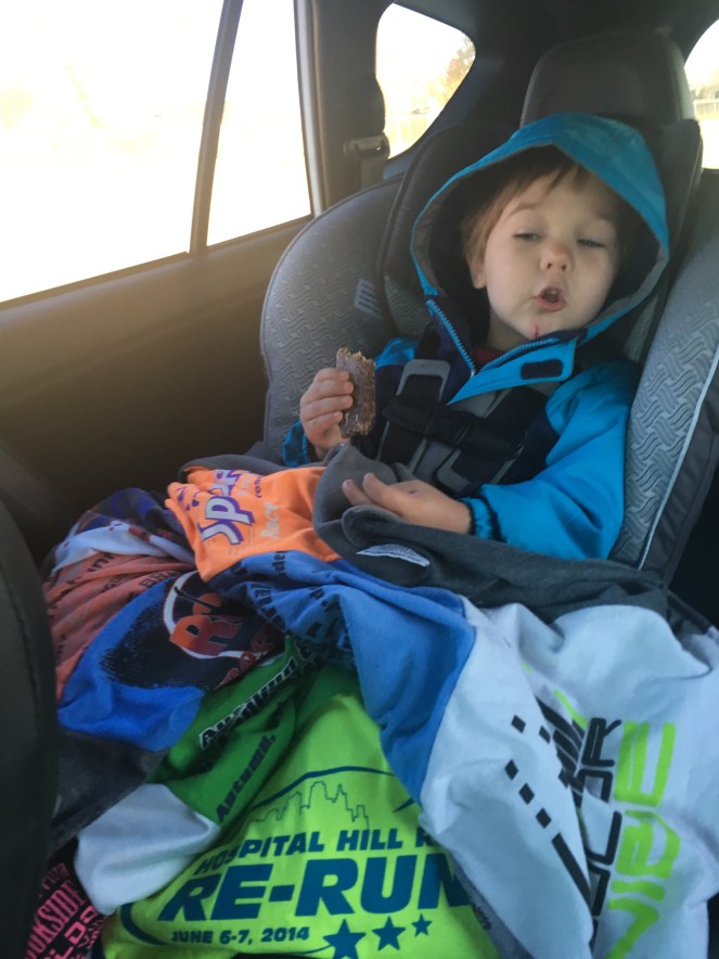 Little man loves my Project Repat quilt 🙂 It is am awesome way to remember the races without having a stack of unworn tees!