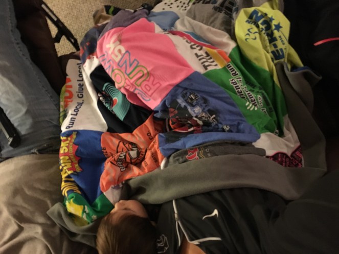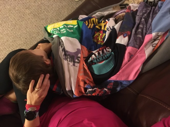 Love your blanket made from race t-shirts. Cozy way to hang on to all those memory shirts.