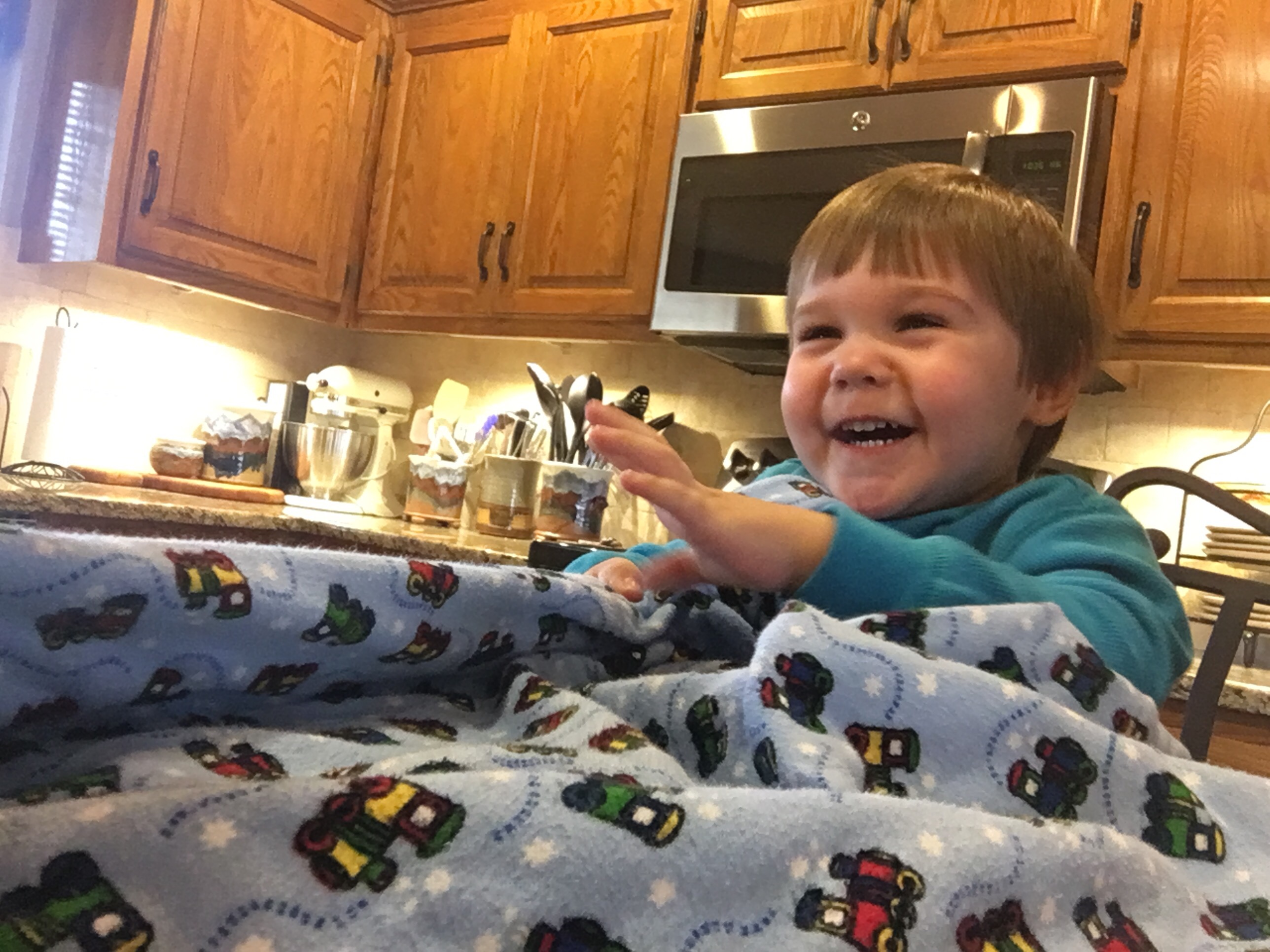 Blanket tug of war in the kitchen