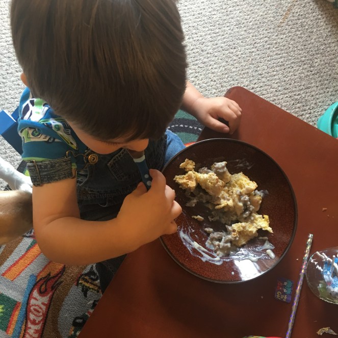 Much like other Sunday mornings, I didn’t start with a run. The rain was still falling, so I decided to wait. Little man woke up early and the hubs made us some biscuits and gravy. Yum!