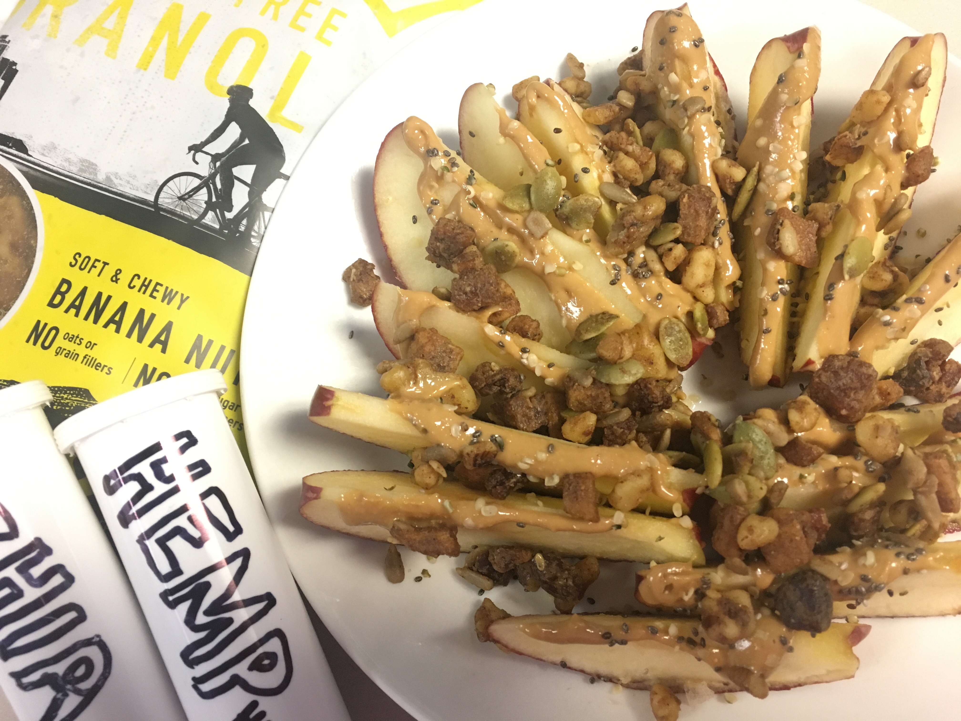 [morning snack] apple + Wildway* grain-free banana nut granola + Once Again* creamy cashew butter + chia seeds + hemp hearts