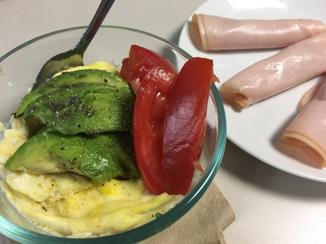 I am all about eating eggs for easy protein – so I nuked 4 eggs (3 whites) and topped them with avocado, tomato, and salt n’ spice. I then wrapped 1/2 of the roma tomato (sliced in 3 pieces) with sliced turkey.
