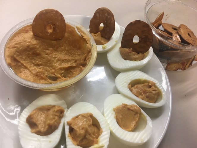 Leftover pretzles/hummus from lunch with “meal prepped” boiled eggs.