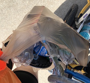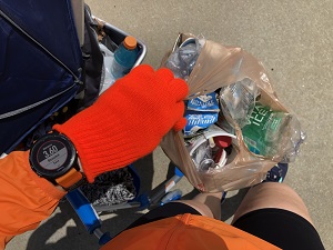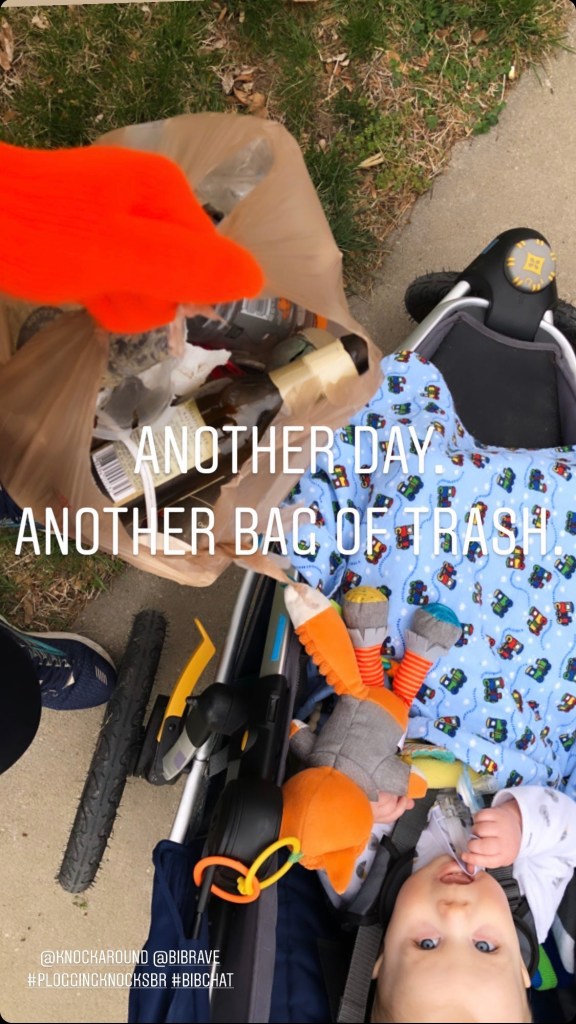 So I packed up the stroller with a few cheap gloves I got from work LONG ago and some plastic shopping bags. Now I didn’t have an excuse as to why I couldn’t pick up trash along the way. I still have to be smart with my hands (don’t touch my face, wash promptly after our run, sanitize the stroller handles, etc.), but that is our new “normal” these days.